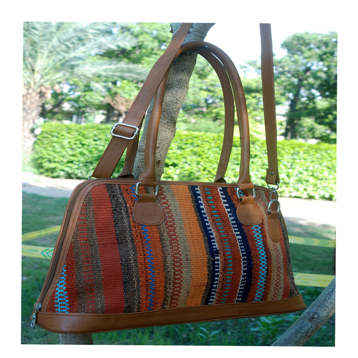 The bags are made from 100% genuine Leather and Woolen kilim. Each bag has one interior Zipper Pocket. This tote bag is large enough to hold your phone and small wallet. Double straps, reinforced bottom, Internal Zipper, and removable shoulder straps make this bag functional in addition to adorable and affordable perfect all year. The Double shoulder straps make this a useful bag for carrying all sorts comfortably. All of our bags are handmade and have premium branded stuff used all over the bag.